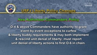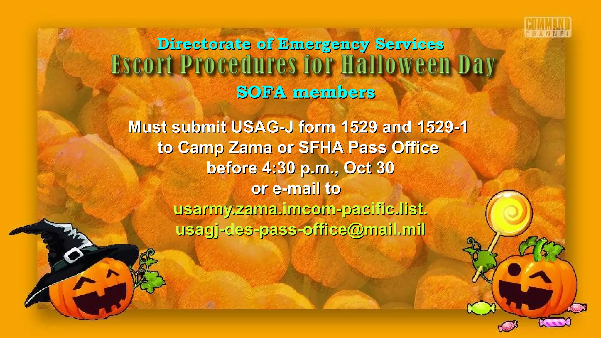 SOFA members and local national employees must submit USAG-J forms 1529 and 1529-1 to the Camp Zama or SFHA Pass Office before 4:30 p.m. on October 30th to invite guests to the installation for the holidays. The forms list the names and details of up to 10 adults and 3 children for SOFA members and up to 5 adults and 3 children for local nationals. Guests will need to show their pass and valid ID at the installation gates.
