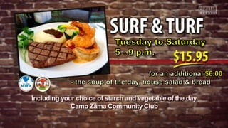 The document provides menus and pricing for meals at the Camp Zama dining facility for different dates and times. It includes menu items like omelets, pancakes, soups, various meat and seafood dishes accompanied by sides like potatoes, rice and vegetables. The prices range from $4.85 to $7.65 depending on the date and time of the meals.