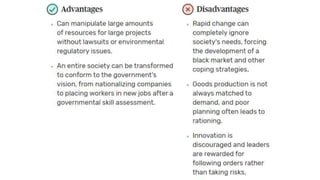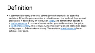 This document provides an overview of command economies, including a definition, key characteristics, examples, advantages, and disadvantages. A command economy is a centralized system where the government makes all economic decisions rather than market forces. Key characteristics include the government creating central economic plans, allocating all resources, setting production quotas and prices, owning monopoly businesses, and enforcing the plan through laws and regulations. Examples given are Belarus, China, Cuba, Iran, Libya, North Korea, and the former Soviet Union. Advantages include rapid mobilization for large projects but disadvantages are an inability to respond to consumer demand, overproducing some goods and underproducing others, and discouraging innovation.