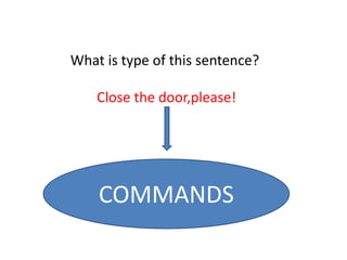 1. Commands are sentences that normally have no overt grammatical subject and whose verb is in the imperative form. There are 4 types of commands: without a subject, with a subject, with "let", and persuasive imperatives.