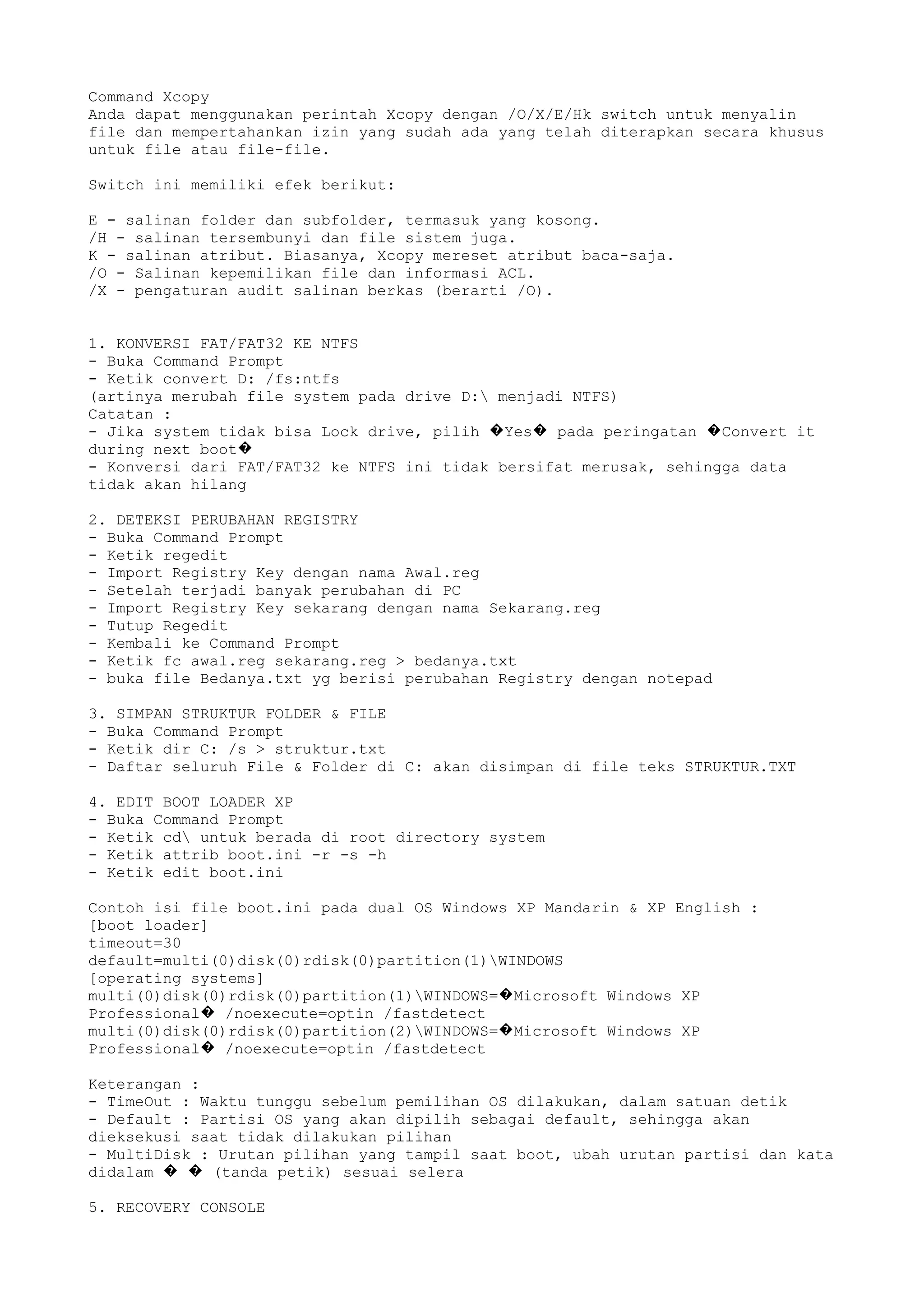 Dokumen ini menjelaskan berbagai perintah dan prosedur menggunakan command prompt di Windows, termasuk cara menyalin file dengan xcopy, mengonversi sistem berkas, mengedit boot loader, serta penggunaan recovery console. Terdapat pula instruksi untuk mengelola partisi, menyimpan informasi sistem, dan melakukan tindakan seperti logoff, restart, dan shutdown. Informasi ini ditujukan untuk pengguna yang ingin memanipulasi dan mengelola sistem operasi Windows melalui command line.