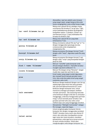 Dokumen ini menjelaskan berbagai perintah command line di Linux yang penting untuk pengguna sistem operasi, termasuk perintah untuk melihat isi file, mengelola direktori, mengganti nama file, dan mencari file. Terdapat juga penjelasan mengenai alat akses jarak jauh seperti telnet dan ssh, serta manajemen proses dan informasi sistem. Selain itu, dokumen ini memberikan gambaran penggunaan perintah untuk manajemen file dan pengeditan teks, serta pipelining hasil perintah.