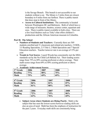 This document summarizes the analysis of Laurel Woods Elementary School and its library collection. It describes the socioeconomic and cultural makeup of the student population and surrounding community. It also analyzes test scores, programs, and needs of the school. Regarding the library collection, it finds that while meeting state standards in size, many non-fiction materials are outdated and the collection needs continued updating to better represent the diverse cultures and information needs of the school community. The librarian's goals are focused on a balanced weeding process and replacing older materials over time within the limited budget.