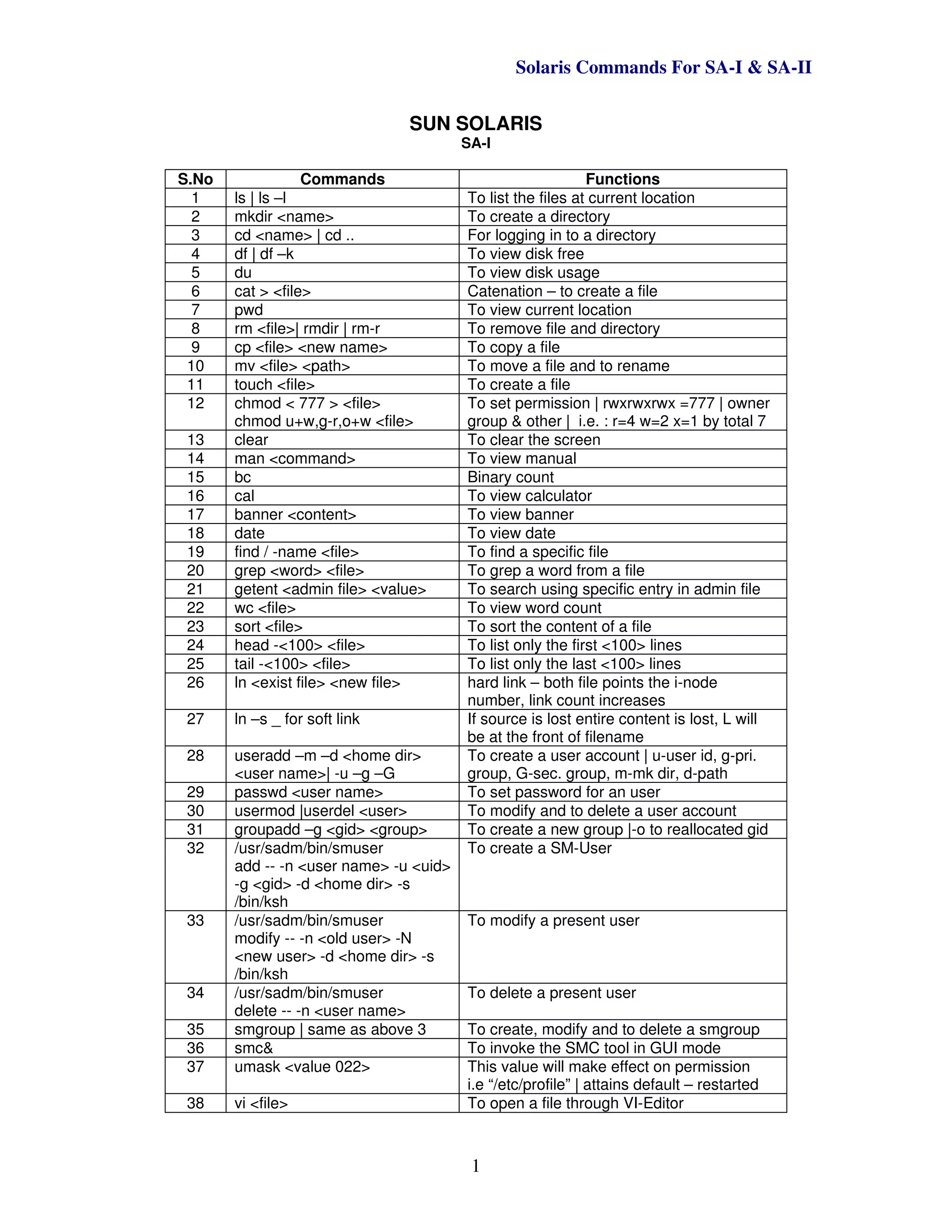 This document provides a summary of Solaris commands for system administrators. It lists 86 common Solaris commands and their functions across two pages. Some key commands covered include ls, mkdir, df, du, cat, pwd, rm, cp, mv, chmod, useradd, passwd, groupadd, and more. The second page also summarizes vi editor commands and commands available at the OK prompt for booting and configuration.