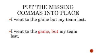 The document provides examples of proper comma usage in sentences. It lists sentences with incorrect comma usage and the corrected versions. The corrections demonstrate inserting commas between independent clauses and items in a list to improve clarity. The document concludes by providing links to interactive comma exercises for students to practice.