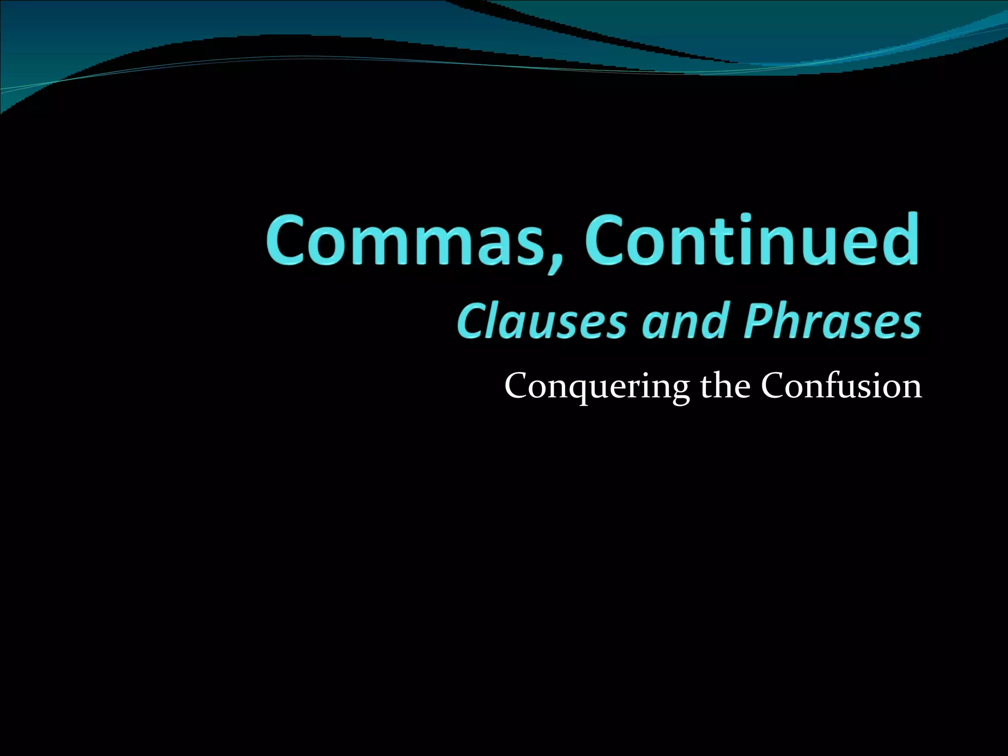 The document discusses the differences between clauses and phrases, and how commas are used to separate them. A clause contains a subject and verb, while a phrase does not. An independent clause can stand alone as a sentence, while a dependent clause cannot and usually begins with a marker word like "while" or "because". Commas are used to separate clauses and phrases in sentences.
