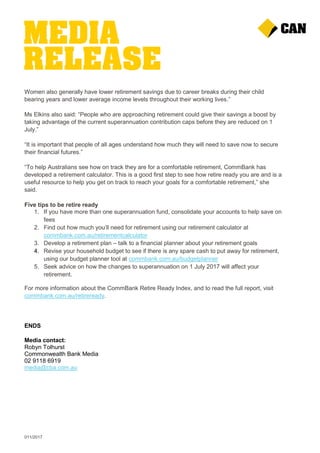 The CommBank Retire Ready Index report indicates that 53% of Australian households are expected to be financially prepared for a comfortable retirement, but this figure drops significantly to 17% when excluding the age pension. The report highlights disparities in retirement readiness between demographics, notably that couples are more likely to be prepared than singles and women generally have lower retirement savings due to various socio-economic factors. It emphasizes the critical role of superannuation in securing retirement funds, especially for younger Australians, and provides five actionable tips for improving retirement readiness.