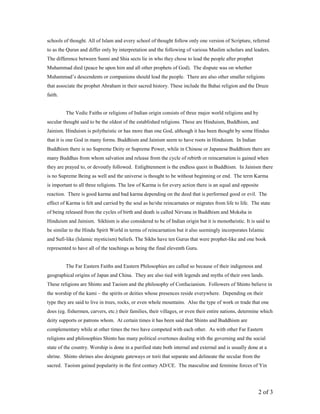 1. The document discusses major world religions including the Abrahamic faiths (Judaism, Christianity, Islam), Indian faiths (Hinduism, Buddhism, Jainism, Sikhism), and Far Eastern faiths and philosophies (Shinto, Taoism, Confucianism).
