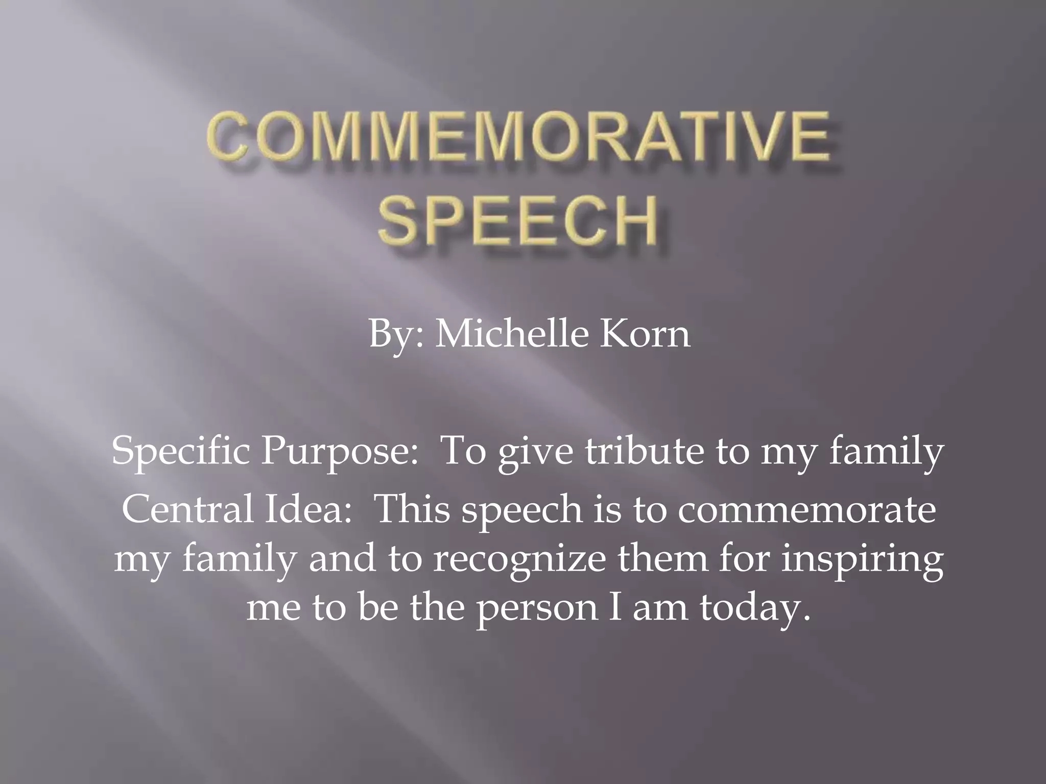 This speech pays tribute to the speaker's family for inspiring who she has become. It recognizes her mother, sister, boyfriend, cousins, and uncle for their support and influence. The speech also commemorates family traditions like birthday celebrations and memories made with pets that have helped shape the speaker's life.
