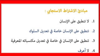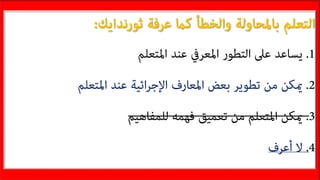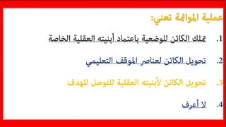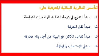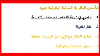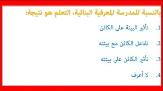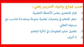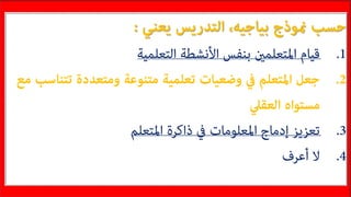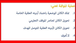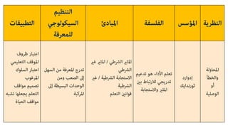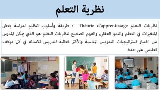 تتناول الوثيقة بيئة التعلم وأهميتها في عملية التعليم، حيث تركز على كيفية استخدام أدوات التعليم واستراتيجيات التدريس لتطوير الكفاءات وتحقيق الأهداف التعليمية. كما تبرز أهمية المحتوى الديداكتيكي وفهم المعارف المختلفة مثل المعرفة التقريرية والإجرائية والشرطية. تهدف الوثيقة إلى تبسيط المفاهيم الديداكتيكية وتوصيف طرق تدريس فعالة.