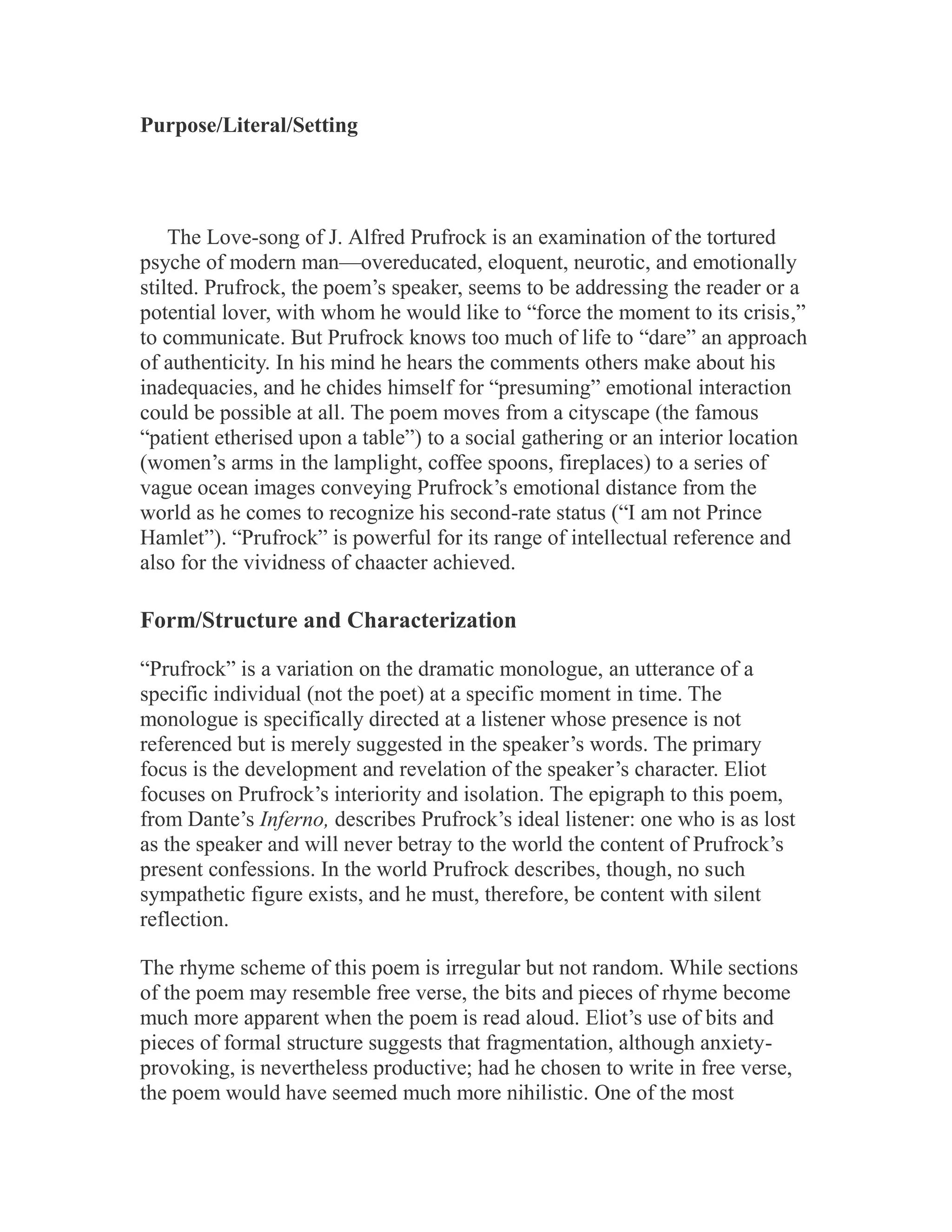 2) Written in the form of a dramatic monologue, the poem focuses on revealing Prufrock's isolated interiority and fragmented mental state. It uses irregular rhyme and refrains to suggest the anxiety but also productivity of Prufrock's fragmented mind.