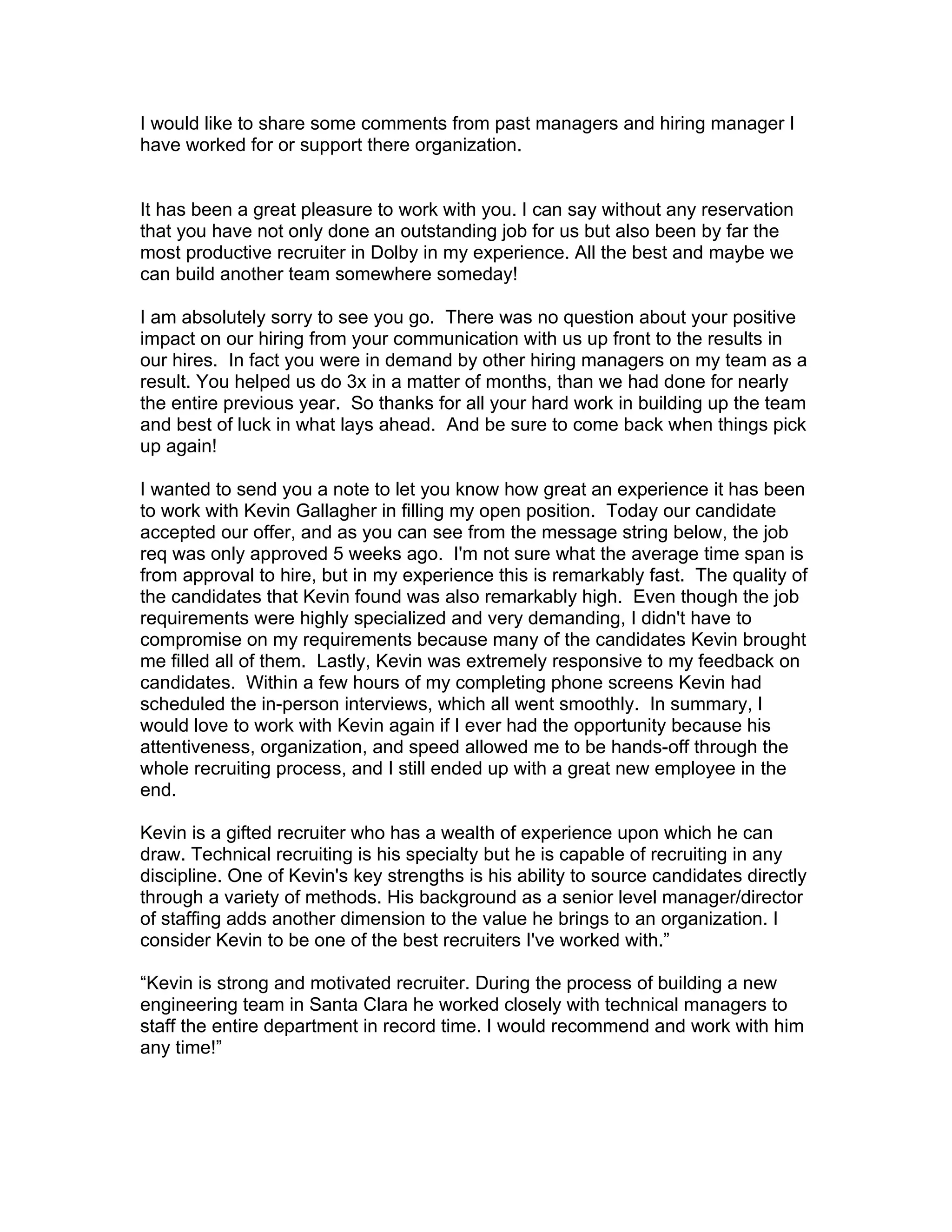 The document contains recommendations from past managers and clients who have worked with Kevin Gallagher. They praise his skills and experience as a recruiter, noting that he is able to find candidates for difficult to fill roles quickly and with high quality. They describe him as responsive, organized, and able to recruit across disciplines. His background as a senior manager in staffing is also cited as adding value. He receives strong recommendations from multiple clients over many years of experience in technical recruiting.