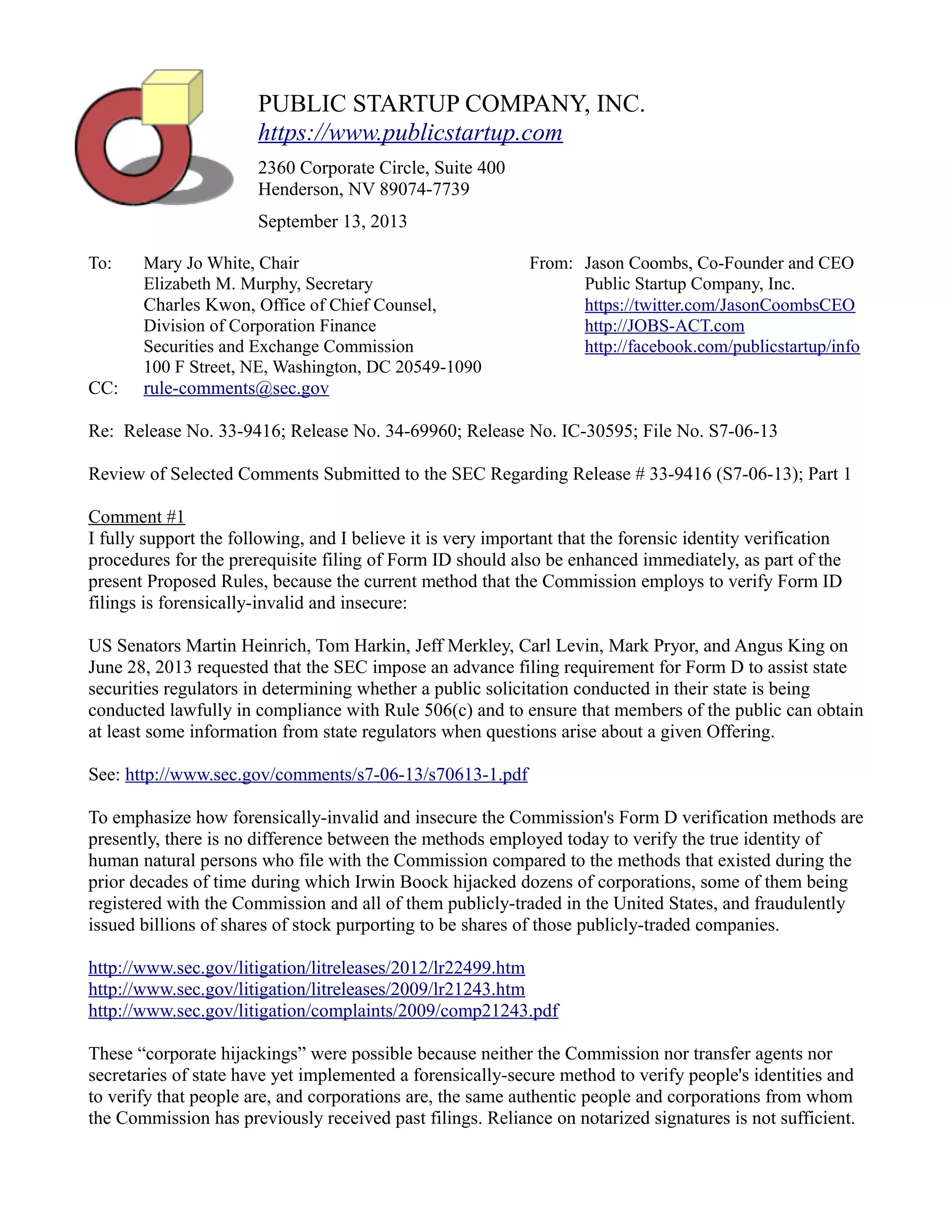 The document contains comments submitted to the SEC regarding proposed rules for Regulation D and Rule 506(c). It includes 6 individual comments addressing issues such as enhancing identity verification for Form ID filings, establishing alternative accredited investor qualifications, concerns about the definition of general solicitation materials, and technical concerns regarding submitting materials to the SEC website to comply with Rule 510T. The comments generally support the proposed rules but suggest some modifications and clarifications.