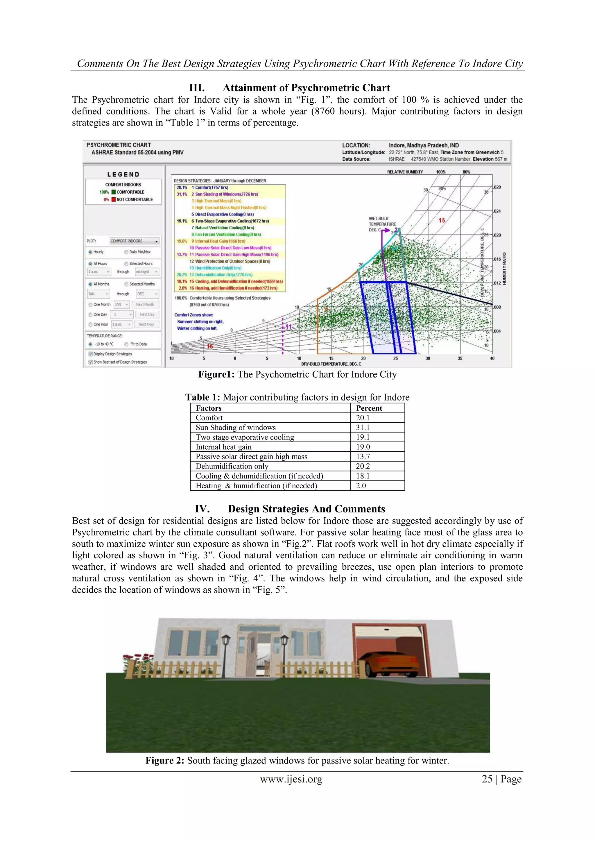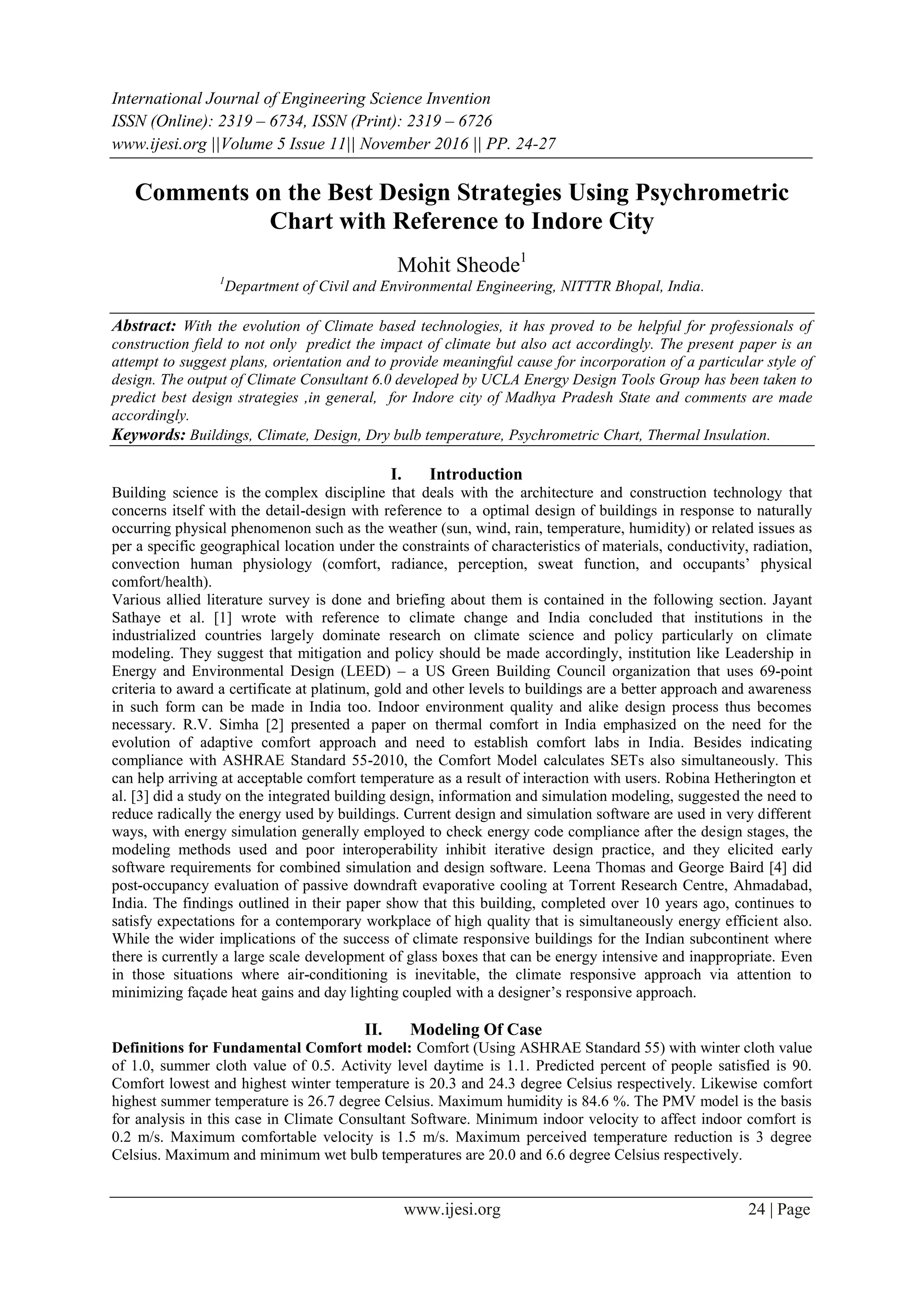 The document discusses design strategies for buildings in Indore, India, utilizing climate-based technologies and psychrometric charts to enhance occupant comfort. It presents findings from various studies and suggests multiple design approaches, including proper orientation for solar heating, natural ventilation, and the use of specific materials. The conclusion emphasizes the importance of software tools like Climate Consultant in improving design practices aligned with climatic conditions.