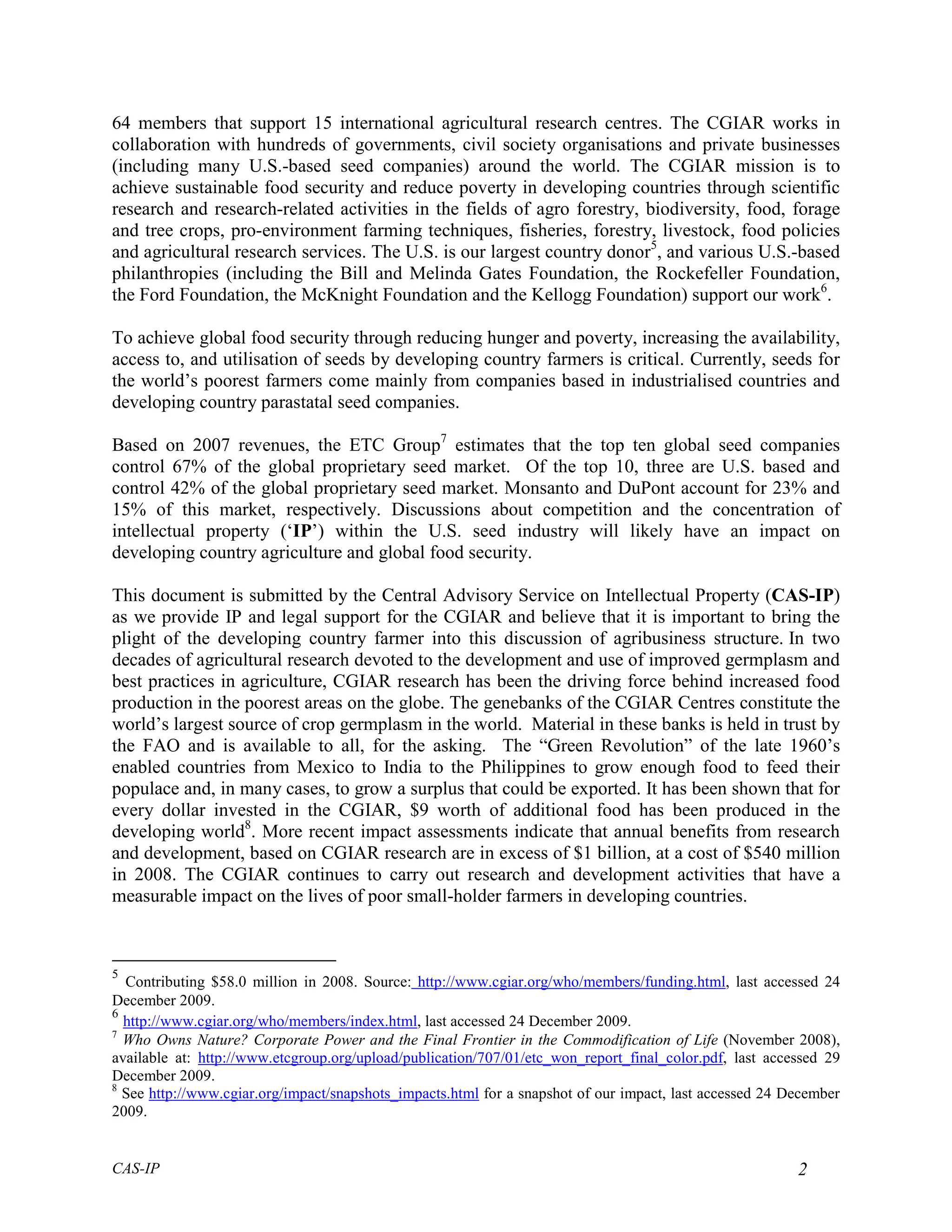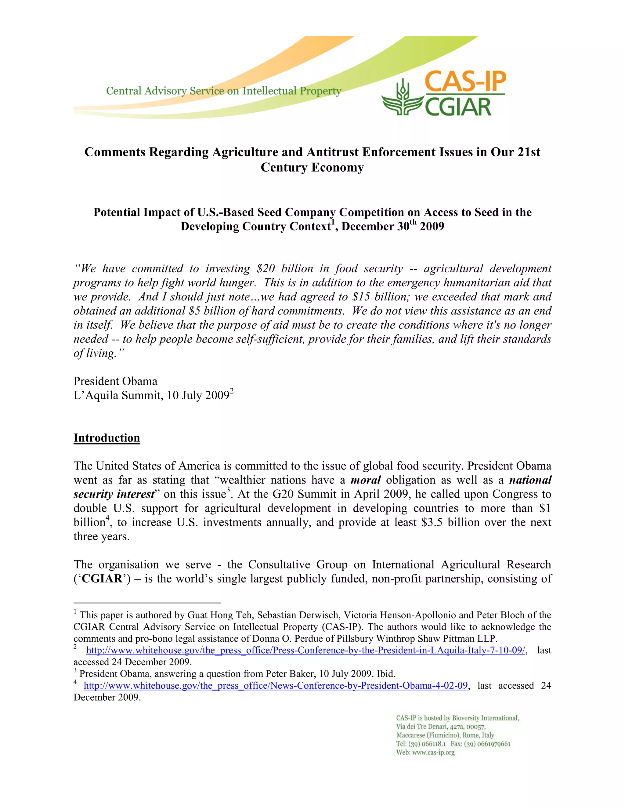 The document discusses the U.S. commitment to global food security and its impact on developing countries, particularly in relation to U.S.-based seed companies and their control over proprietary seed markets. It emphasizes the importance of access to diverse seed sources for impoverished farmers and the potential risks posed by increasing concentration in the seed industry due to mergers and acquisitions. Additionally, it highlights the implications of competition regulations in both the U.S. and developing countries, stressing the need for equitable access to agricultural technologies for enhancing food security.