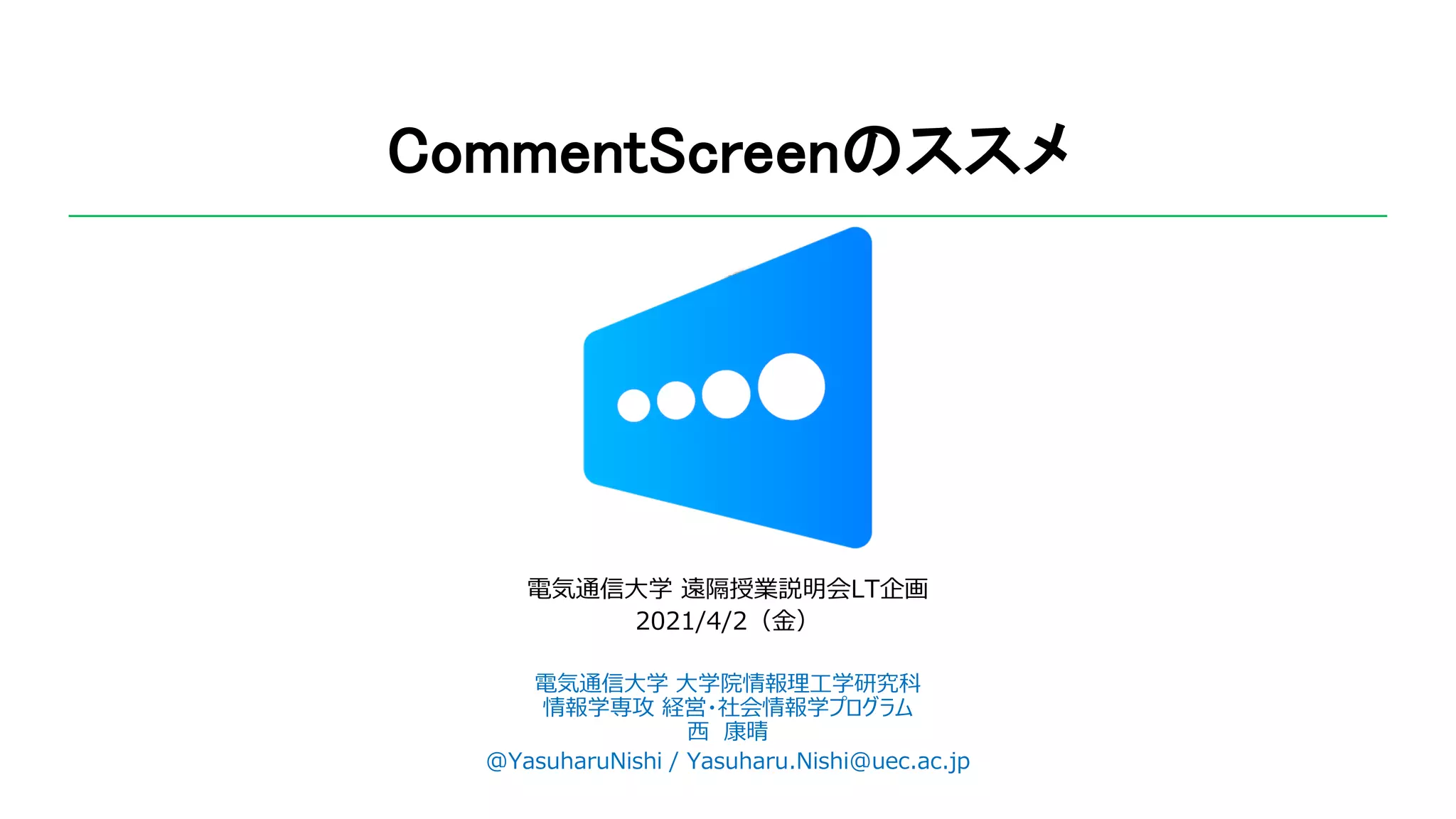 電気通信大学遠隔授業説明会LT企画用のスライドです。CommentScreenを勧める動画です。