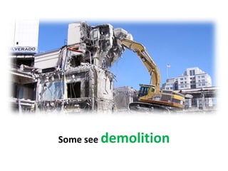 This document discusses environmental sustainability from different perspectives. While some may see demolition, devastation and erosion from construction projects, Titan America focuses on reusing materials, erosion control blocks, and seeing other chances to be environmentally sustainable. The overall message encourages considering sustainability in construction and development.