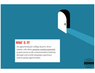 This document outlines a program for college leavers from estates with creative potential to gain experience in the communications industry. The program includes a six-week unpaid pop-up agency experience, followed by potential paid placements at communications agencies. Interested applicants must fill out a creative application form by June 10, 2023, with an initial chat planned for late June.