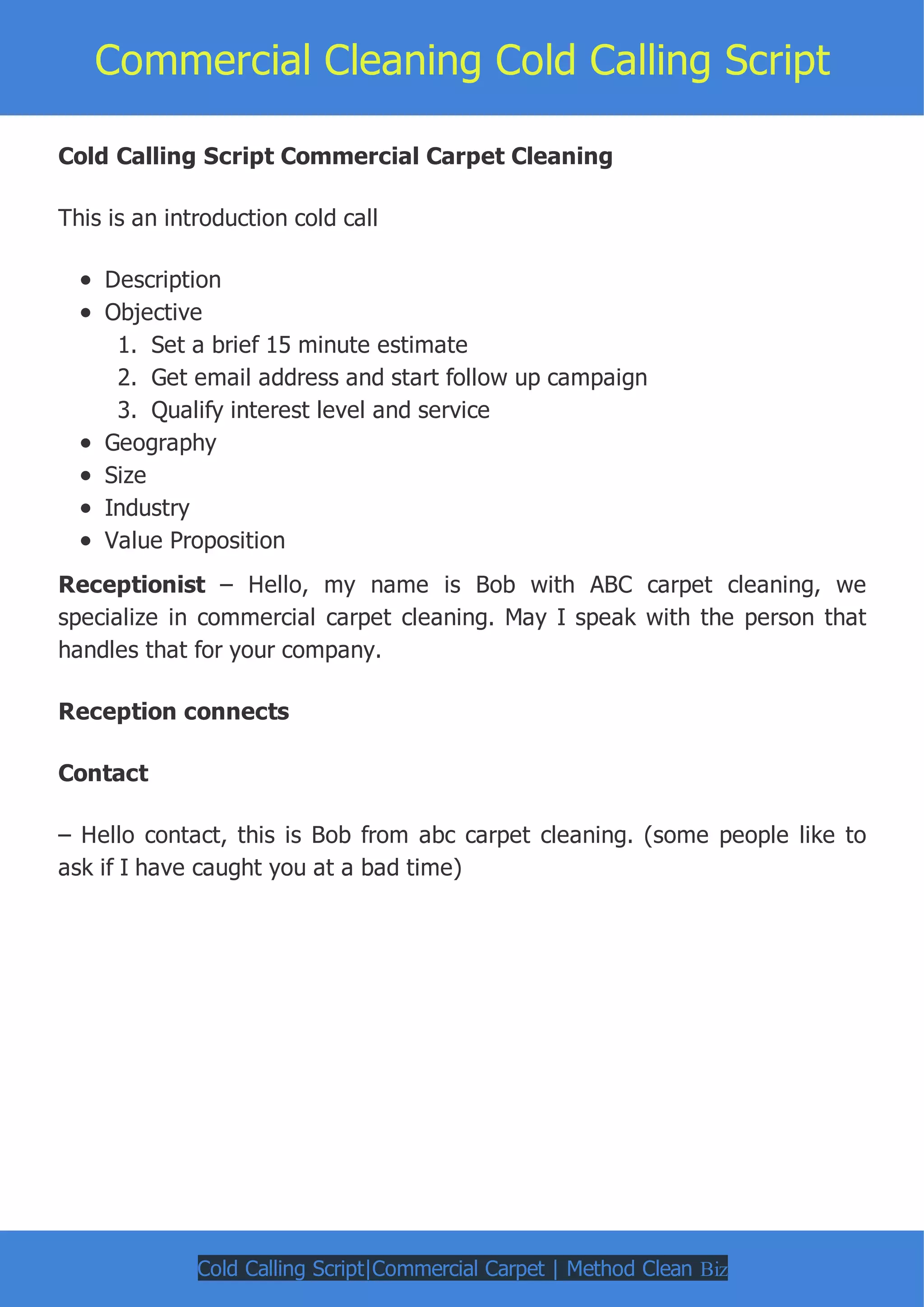 This document is a cold calling script for commercial carpet cleaning services, primarily aimed at facilitating introductions to potential clients and setting up cleaning programs. It includes specific talking points, questions to assess client needs, and strategies to capture leads and email contacts. The script emphasizes the company's unique selling propositions and previous experience with similar clients.