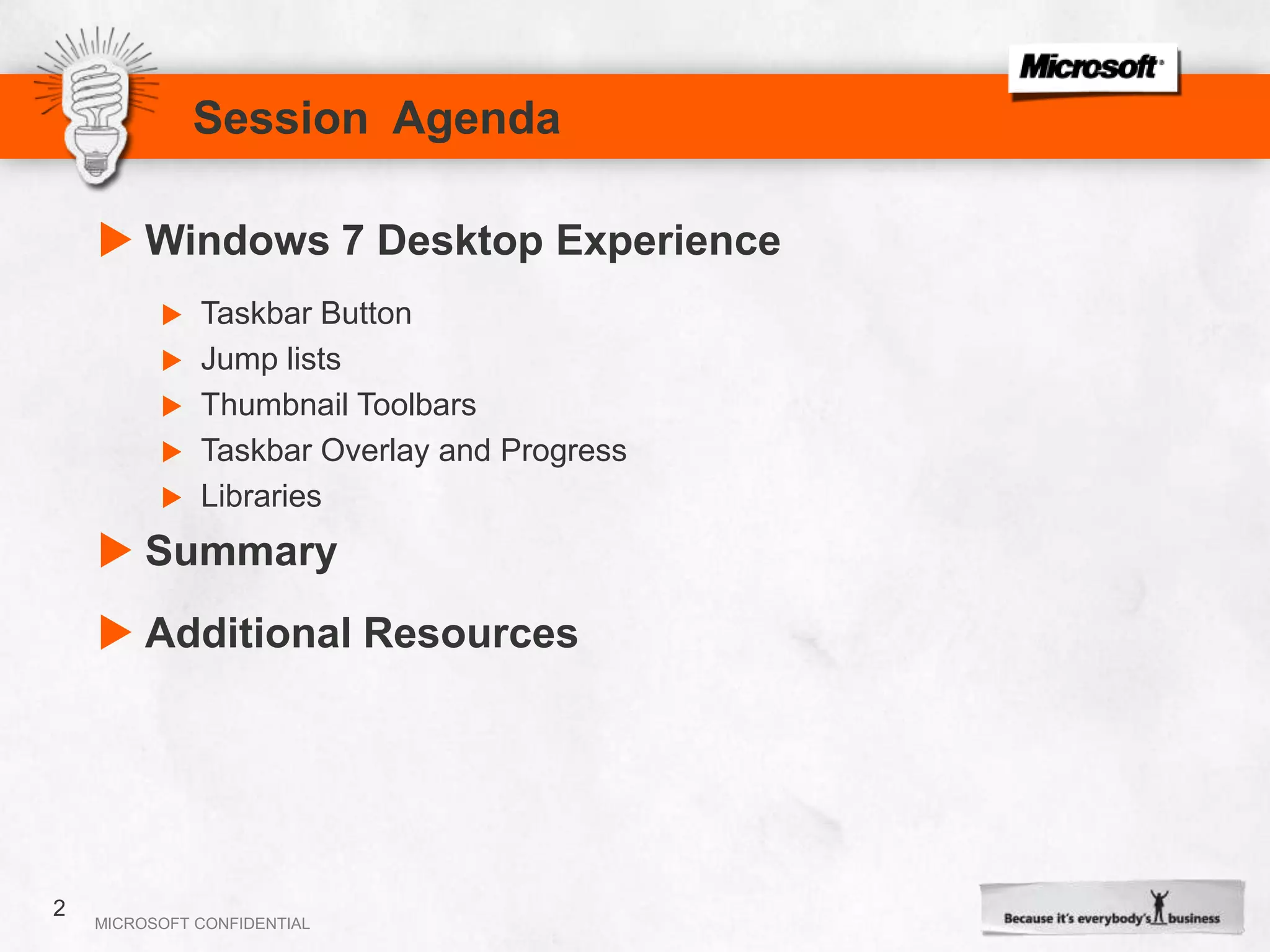 The document discusses several new features in Windows 7 for application developers, including taskbar buttons, jump lists, thumbnail toolbars, taskbar overlays, and libraries. It provides an overview of each feature and design considerations for incorporating them. Resources for learning more about Windows 7 development include books, online documentation, code galleries, blogs, training courses, and a developer toolkit.