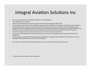 This document provides information on Integral Aviation Solutions Inc, which is a broker of commercial aircraft, aerospace equipment, and unmanned aerial systems. Some key details include: