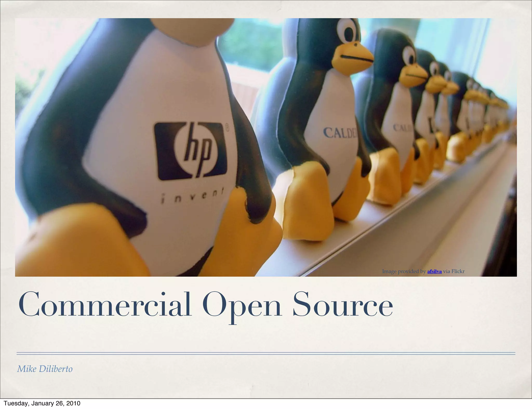 The document outlines Mike DiLiberto's career journey from studying computer science to working in R&D and corporate roles, highlighting his passion for problem-solving. It contrasts closed source and open source software development, discussing the benefits of open source, including faster development and consumer-driven innovation. The importance of community, data collection, and marketing strategies for open source firms is emphasized, along with potential revenue models through support and customization services.