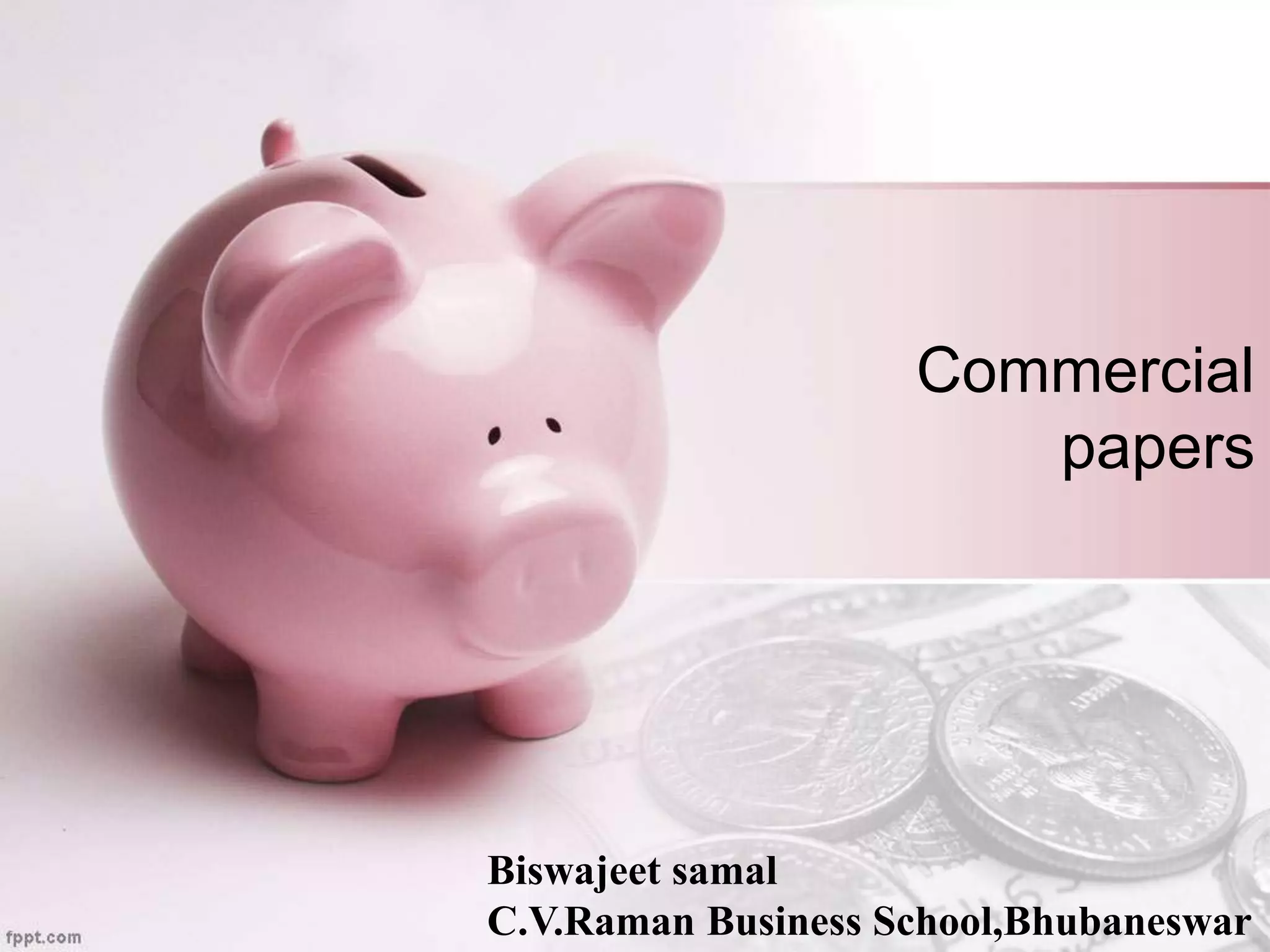Commercial paper is a short-term unsecured promissory note issued by highly rated corporations, primary dealers, and financial institutions to raise funds. It was introduced in India in 1990 to provide corporate borrowers and investors an additional short-term borrowing and investment instrument. Commercial paper can be issued for a minimum of 7 days to a maximum of one year. Eligible issuers include corporates, primary dealers, and financial institutions, while eligible investors include individuals, banks, corporations, NRIs, and FIIs.