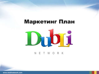 Документ описывает маркетинговый план для бизнес-партнеров в сети Dubli, предлагая возможность получения дохода через продажи Dubli поинтов и создание клиентской базы. Партнеры зарабатывают комиссионные от 5% до 25%, в зависимости от уровня квалификации и объема продаж, при этом для получения дохода необходимо иметь активных клиентов. Существуют различные уровни квалификации, такие как лидер и директор, которые открывают дополнительные возможности для заработка.