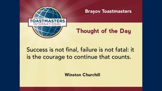 The Brașov Toastmasters Club emphasizes the importance of commitment, connection, and change in achieving excellence while preparing members for challenges in speaking. It highlights the need for proactive participation in meetings and reflects on the journey of self-improvement and goal attainment. The club aims to equip individuals to make a positive impact in their communities.
