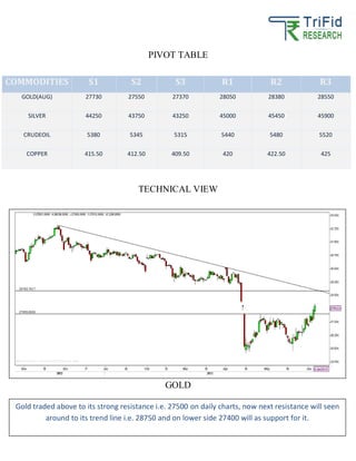 The document provides a technical view of gold and other commodities, including support and resistance levels for gold, silver, crude oil, and copper. Gold is currently trading above a strong resistance level of 27,500, with the next resistance at 28,750 and support at 27,400. The information is part of a broader market analysis from Trifid Research.