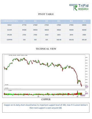 The document provides a technical analysis of copper commodities alongside other metals like gold and silver. It highlights that copper closed below a significant support level of 340, indicating potential further decline towards the next support around 330. Additional data includes resistance levels for various commodities.