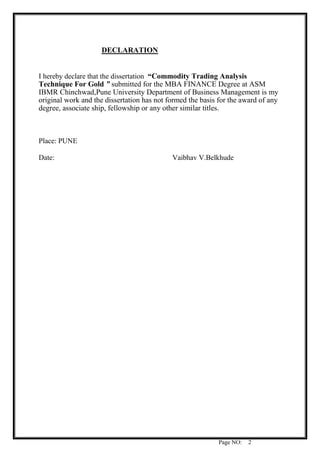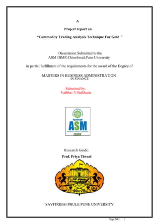 The document is a project report on 'Commodity Trading Analysis Technique for Gold' submitted for an MBA in Finance. It explores price movements of commodities like gold, silver, and copper, and how various factors such as the US dollar influence these markets. The study aims to analyze technical indicators for managing risks and making profitable investments in commodity trading.
