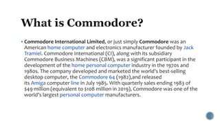 Commodore International was an American electronics manufacturer founded by Jack Tramiel that was significant in the development of the home personal computer industry in the 1970s-1980s. Commodore developed and marketed successful computers like the Commodore 64, which was the best-selling PC of all time with over 17 million units sold. Commodore also released the Amiga line of computers in 1985 and was one of the largest PC manufacturers, but struggled later on and eventually declared bankruptcy in 1994.