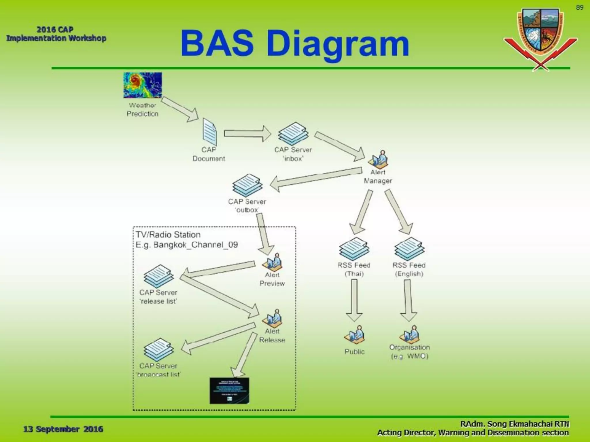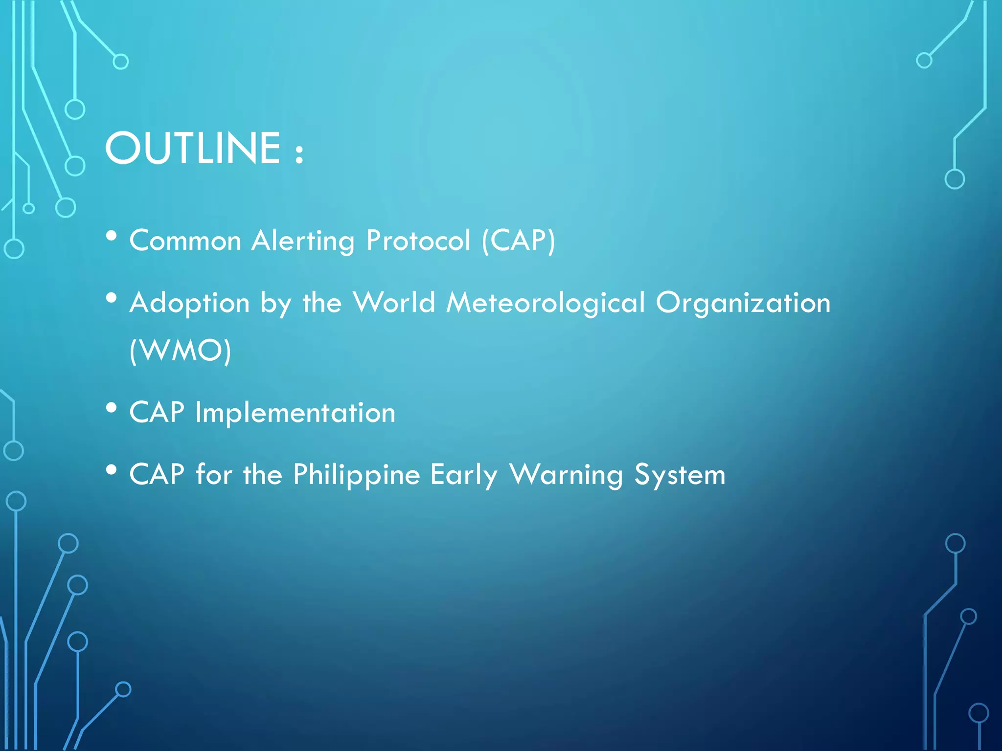 The document discusses the Common Alerting Protocol (CAP), which is a standard format for communicating hazard warnings across all media types. It was adopted by the World Meteorological Organization (WMO) for early warning systems. CAP allows communication of any hazard type to the public or designated groups. The document outlines CAP implementation in various countries and organizations, including the Philippines where CAP will be used to disseminate early warnings over the internet, smartphones, radio, and TV.