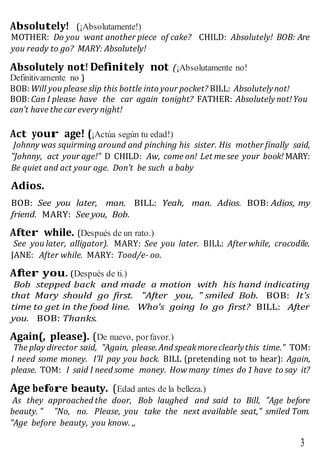 This document provides examples of common American phrases and expressions used in everyday conversation. It contains over 1,700 phrases organized alphabetically. Each entry includes the phrase, its meaning, and an example showing a typical context for how the phrase is used. The examples aim to illustrate colloquial American speech and often contain humor, exaggeration, or sarcasm. The document is intended as both a reference for learning these expressions and as a guide for understanding their typical usage in conversation.