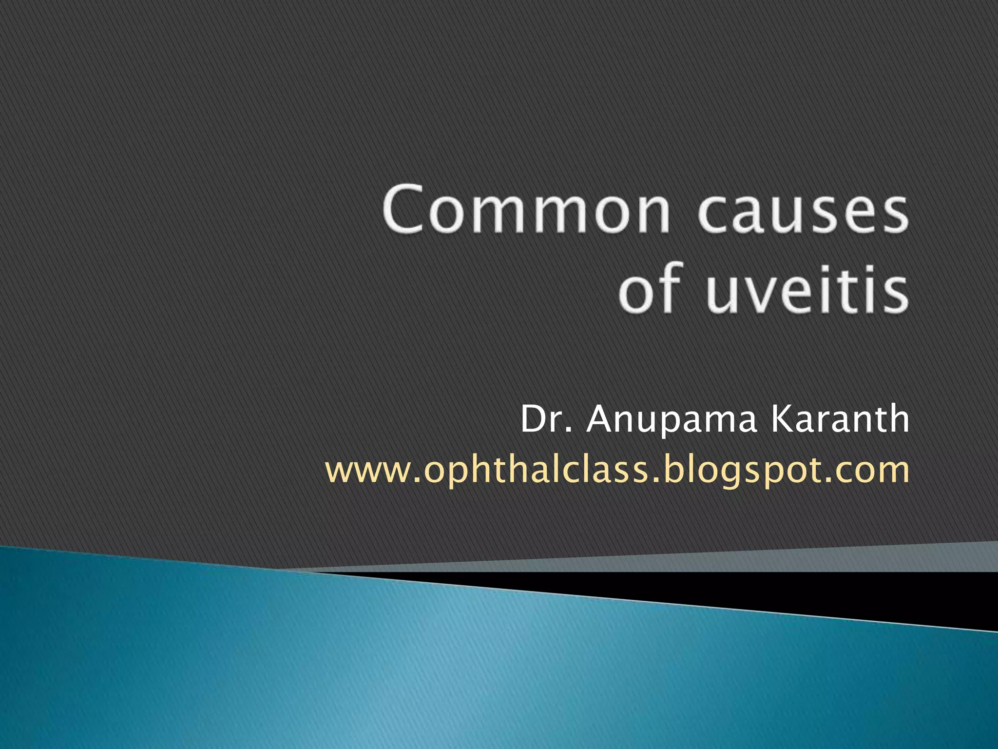 The document discusses the classification and causes of uveitis, detailing the types (anterior, intermediate, posterior, panuveitis) and their associated infectious and non-infectious factors. It emphasizes the importance of narrowing down differential diagnoses based on disease duration, inflammation type, and patient demographics. Specific causes such as infections, autoimmune disorders, and idiopathic cases are categorized for clarity in diagnosis and treatment.