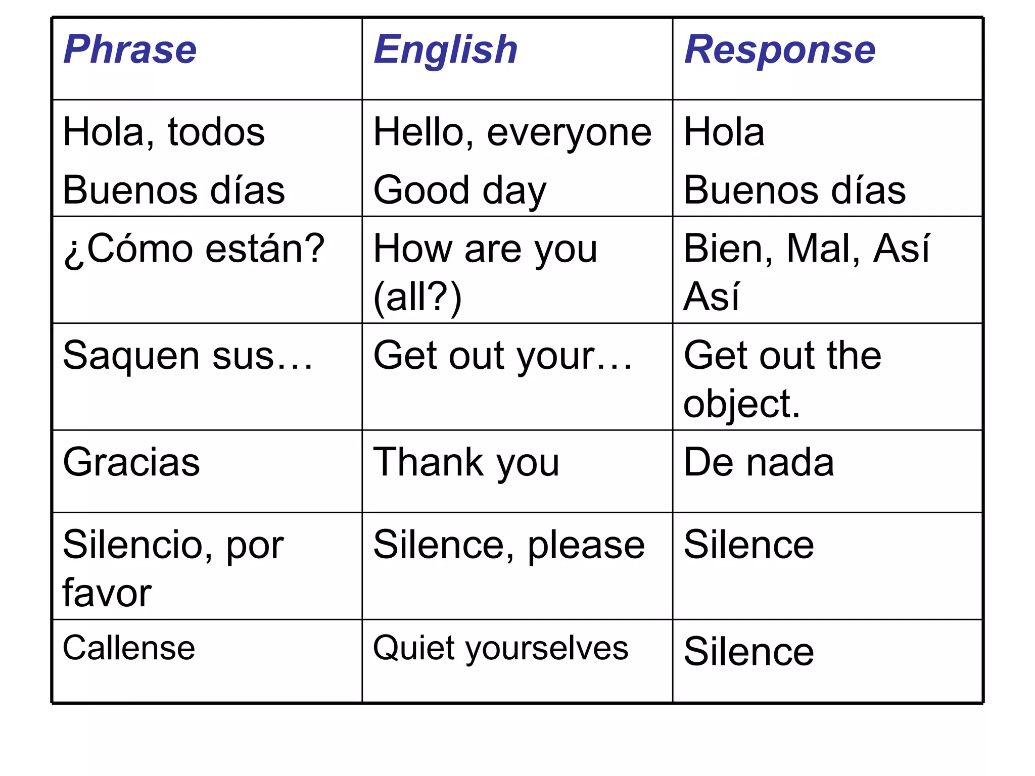 Common classroom phrases in Spanish and their English translations. The phrases include greetings like "Hola" and "Buenos días", asking students how they are, asking students to take out materials, saying thank you, asking for silence, asking how to say something in Spanish or what something means in English, asking when something occurs and referring to days of the week. The document provides basic classroom language to help teachers and students communicate.