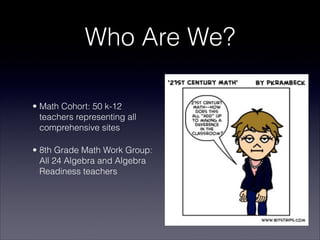 The document discusses implementing the Common Core State Standards for mathematics in a school district. It describes a math cohort of 50 K-12 teachers working to transition to the new standards, including an 8th grade math work group. The cohort is focused on the mathematical practices of the standards and being innovative with technology. Shifts have already been made in grades K-7, while algebra and geometry teachers are shifting to more strategic and extended thinking over rote practice. Next steps include engaging stakeholders, analyzing gaps, targeted professional development, and communicating information in multiple formats.