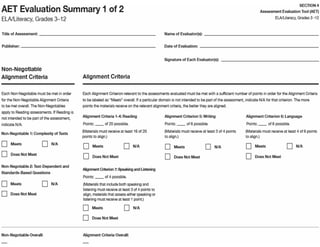 The Common Core State Standards (CCSS), launched in 2009, establish consistent educational guidelines for K-12 students in math and English Language Arts across participating states, addressing the lack of standardization in previously adopted state-specific standards. The CCSS emphasize critical thinking, communication, collaboration, and creativity while defining expectations in reading, writing, speaking, listening, and language skills from kindergarten through 12th grade. Additionally, the document outlines assessment practices to evaluate student progress and ensure alignment with the CCSS.
