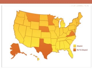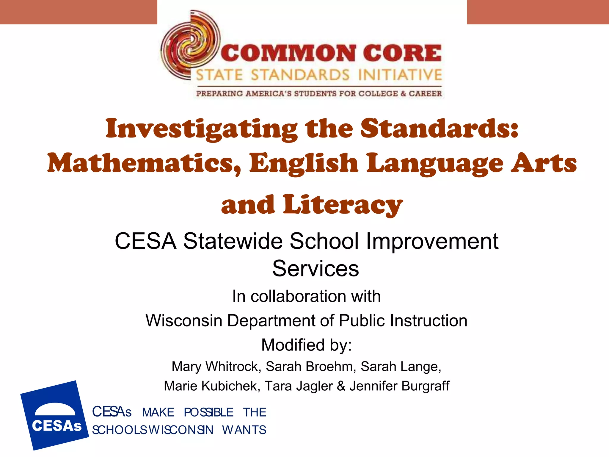 This document provides an overview of the Common Core State Standards for mathematics and English language arts. It discusses the impetus for developing common standards across states to better prepare students for college and careers. It outlines the overall structure of the mathematics standards, including the domains, standards for mathematical practice, and coherence across grade levels. It also describes the overall structure of the English language arts standards, including the strands of reading, writing, speaking and listening, and language. The standards are designed to ensure students gain the knowledge and skills needed to be successful after graduation.