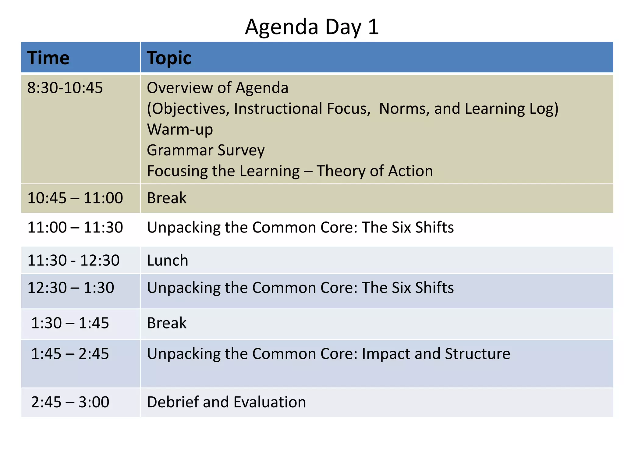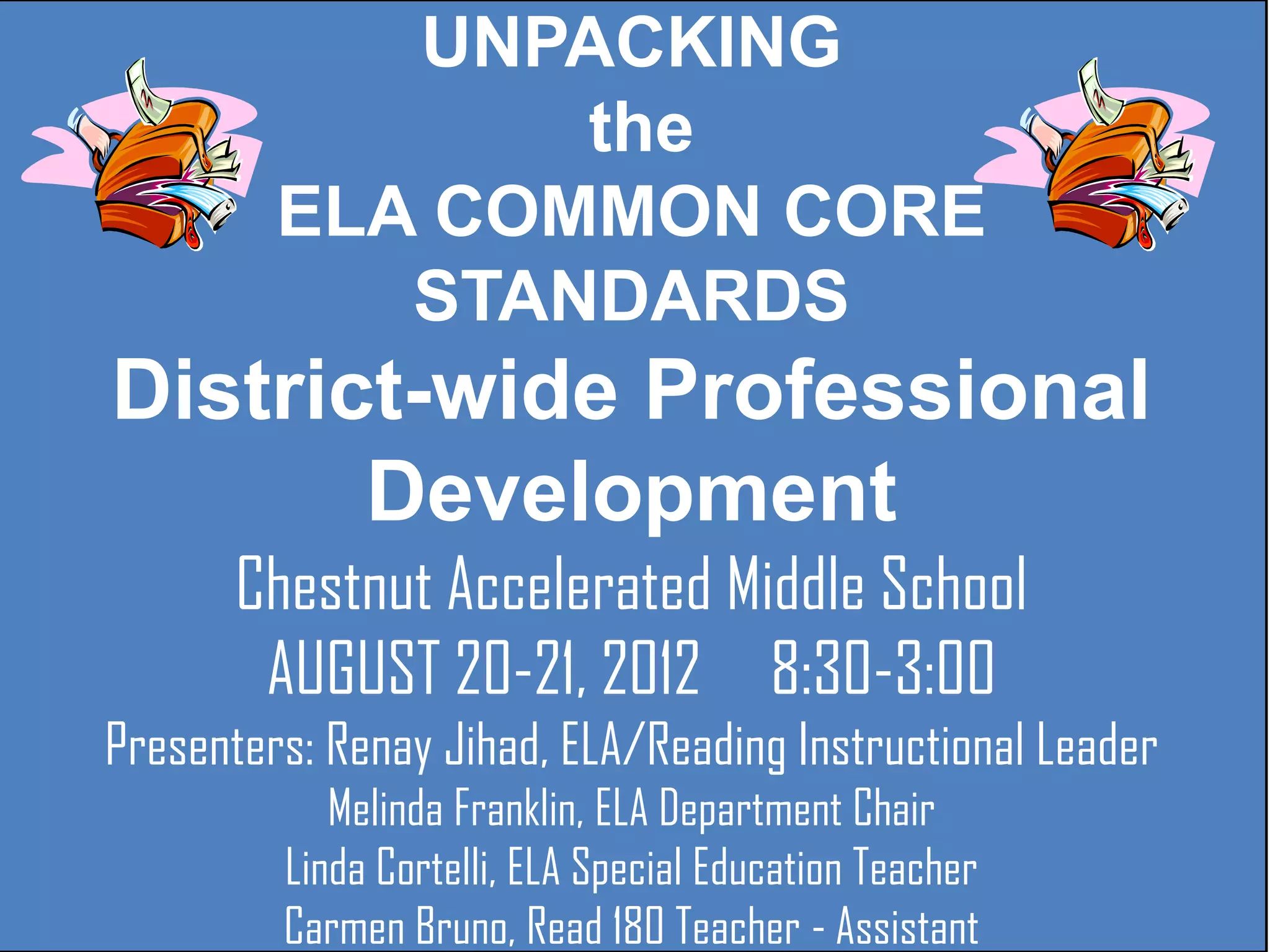 The document outlines a professional development agenda focused on unpacking the ELA Common Core Standards at Chestnut Accelerated Middle School over two days in August 2012. It aims to provide educators with tools, resources, and knowledge about the six key shifts in the standards to enhance literacy instruction. Participants will engage in activities, discussions, and evaluations to understand and implement these shifts effectively in their teaching practices.