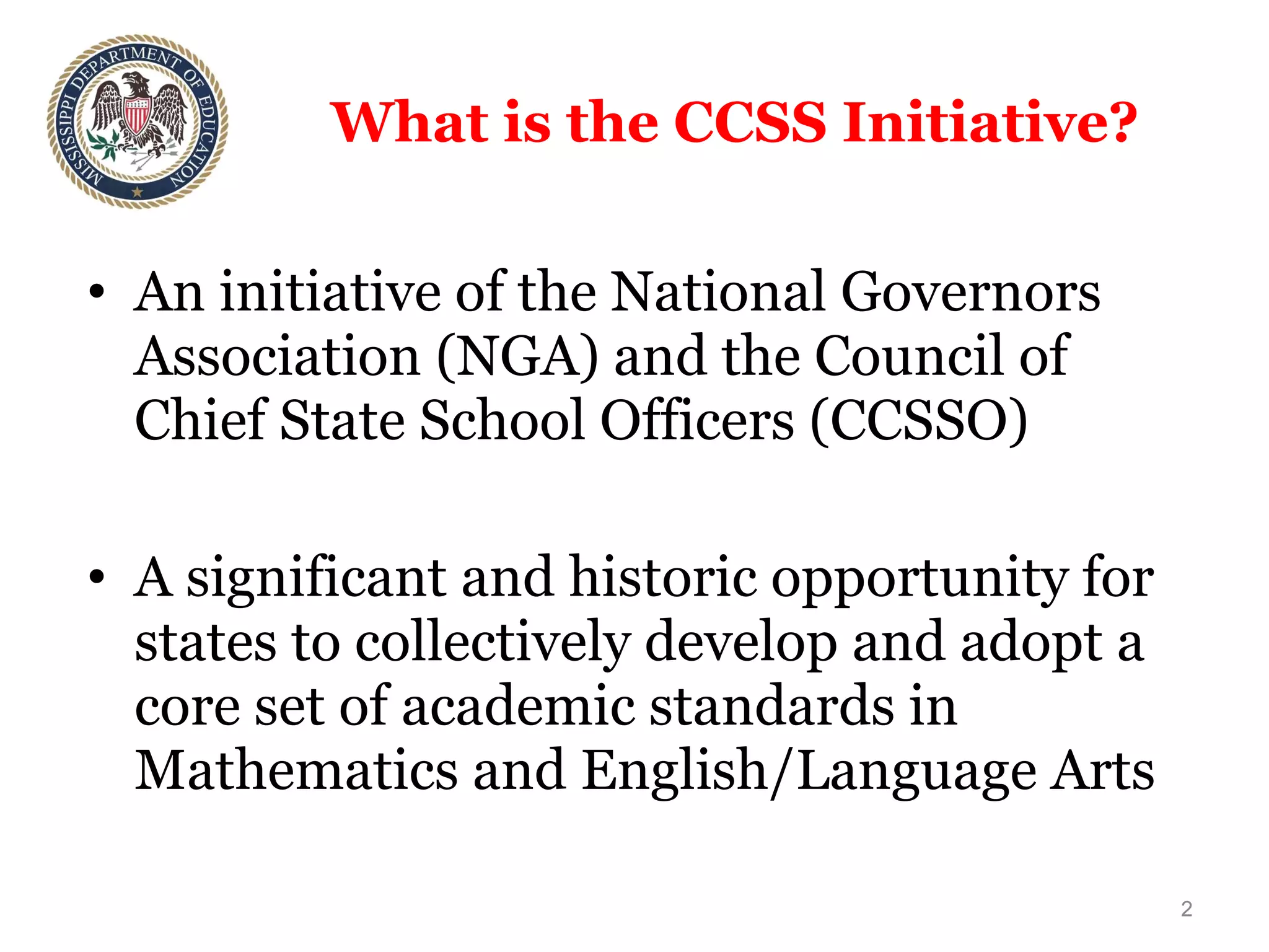 The document outlines the Common Core State Standards (CCSS) initiative, designed to establish a consistent set of academic standards in mathematics and English/language arts across states, aimed at preparing students for global competition. It details the alignment of Mississippi's education framework with the CCSS, highlighting key design considerations, instructional strategies, and the development of new assessment proposals to measure student readiness for college and careers. The document also describes the implementation timeline and resources available for educators to facilitate the transition to these standards and assessments.