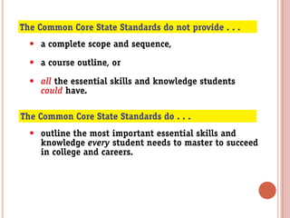 The document provides information about the Common Core State Standards including: