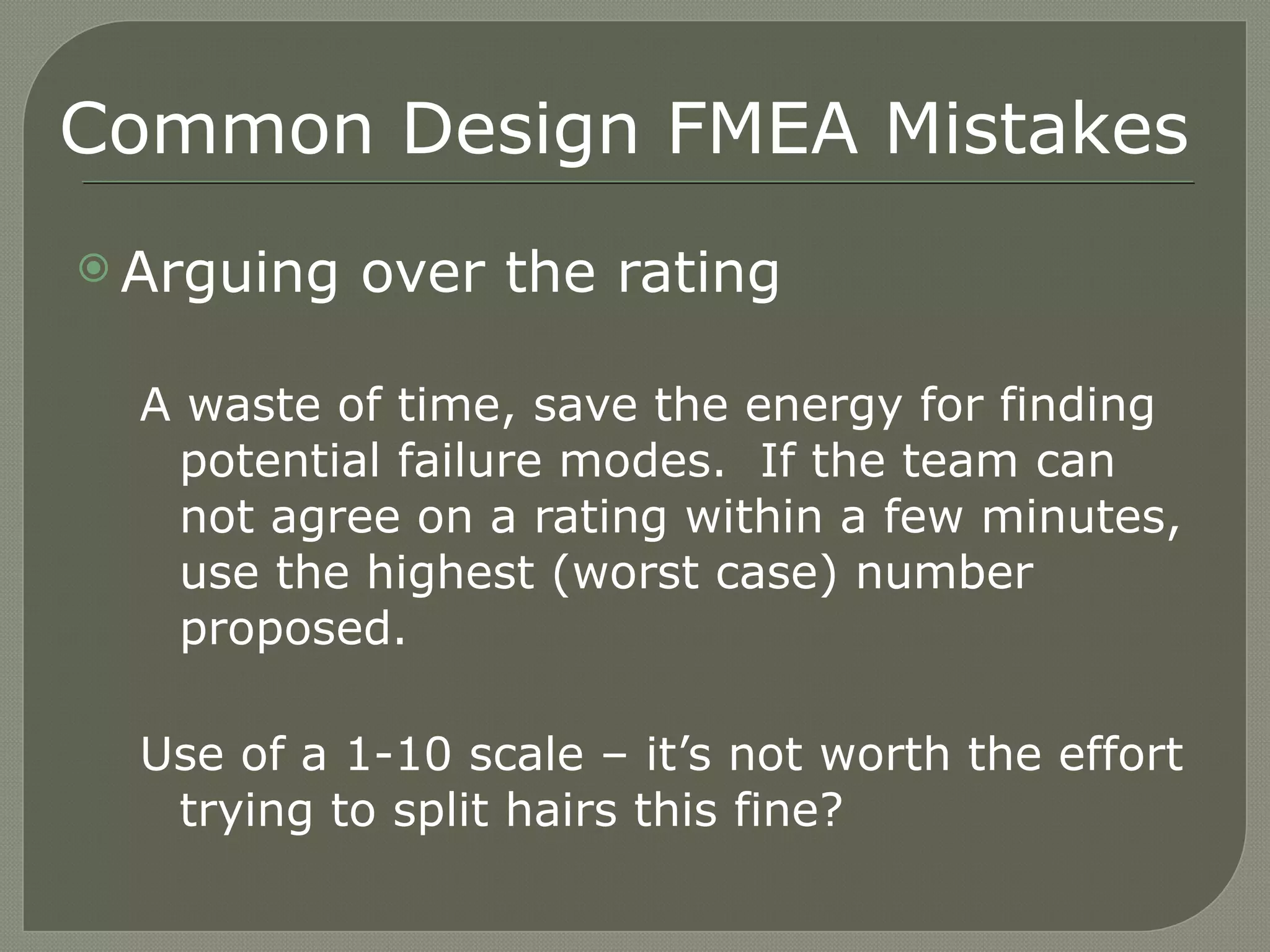 The document discusses common mistakes in design failure mode and effects analysis (DFMEA). It recommends (1) not wasting time arguing over ratings, (2) rating the occurrence of failure causes rather than just occurrence, (3) considering preventability rather than just detection, (4) updating the DFMEA often as the design evolves, and (5) evolving the DFMEA from an initial conceptual analysis to a bottom-up analysis of the final design.