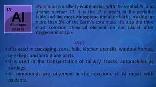 The document discusses the common uses of several chemical elements. It provides the symbol, atomic number, basic description and 3-4 key uses for each of the following elements: aluminum, argon, barium, beryllium, boron, bromine, cadmium, calcium, carbon, chlorine, chromium, copper, fluorine, gold, helium, hydrogen, iodine, iron, lead, lithium, magnesium, manganese, mercury, neon, nickel, nitrogen, and oxygen. The elements have a wide variety of industrial and commercial applications including in materials, manufacturing, energy, healthcare and more.
