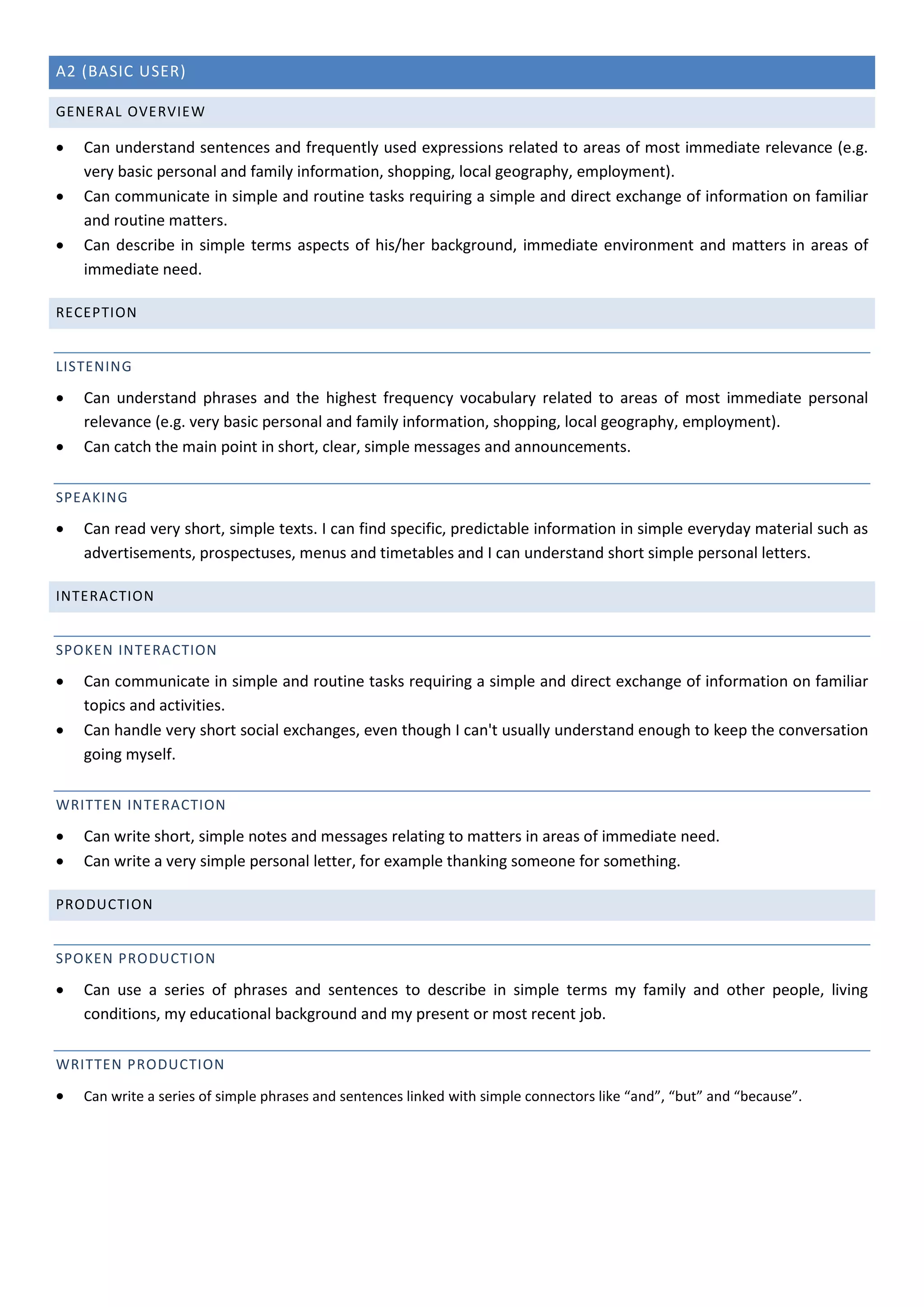The document outlines the Common European Framework of Reference for Languages (CEFR) levels for language proficiency. It provides detailed descriptions of what individuals can do at each level across several domains including listening, reading, spoken interaction, written interaction, spoken production and written production. At the lowest A1 level, individuals can understand and use basic phrases to communicate personal details. Proficiency increases through the A2, B1, B2 levels with ability to understand more complex language, discuss abstract topics and interact spontaneously with native speakers. The highest C1 level involves fluency, flexibility and ability to produce clear, well-structured writing on complex issues.