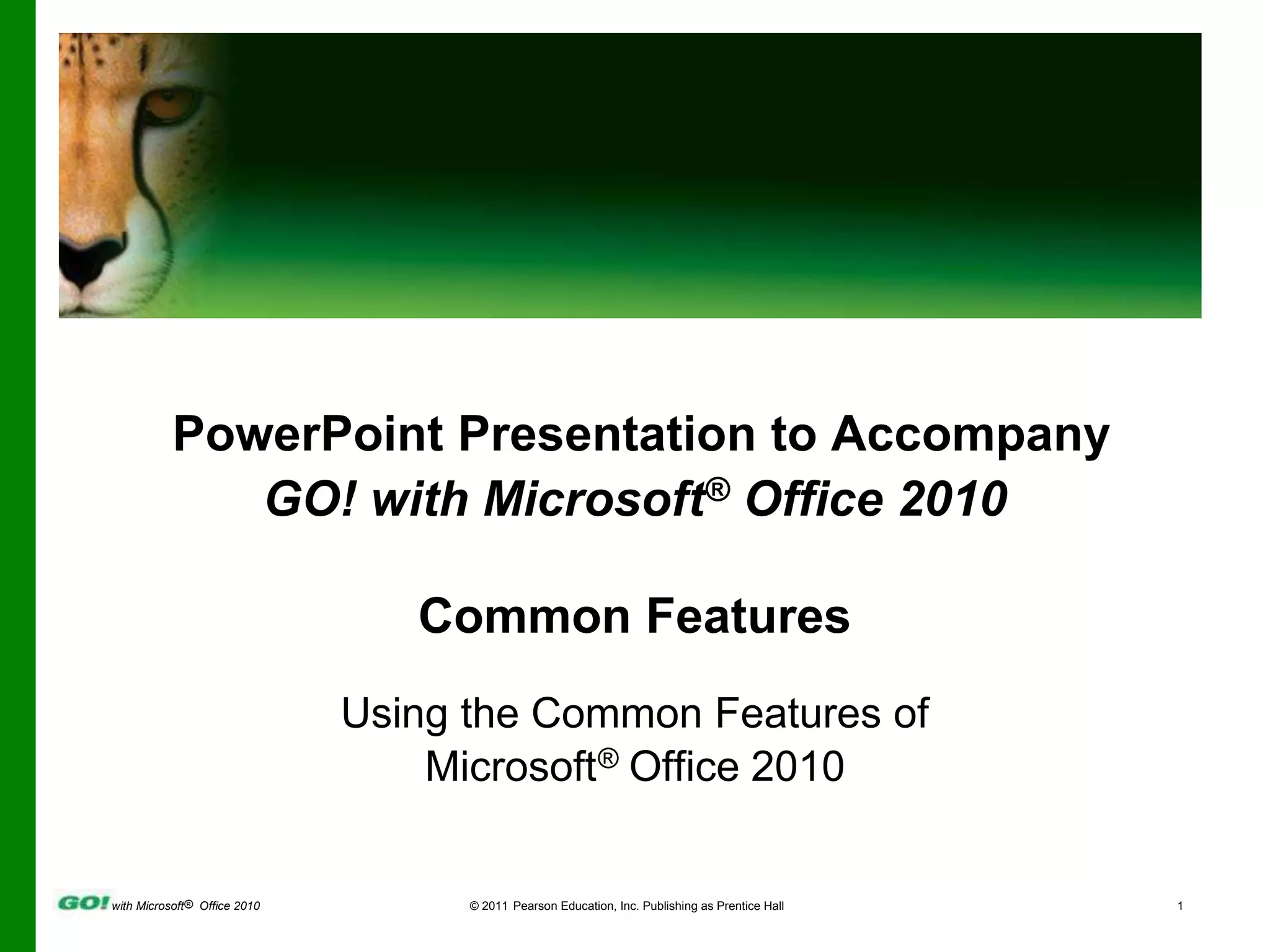 The document provides an overview of common features and functions in Microsoft Office 2010 applications. It covers how to use Windows Explorer to locate and manage files and folders, launch Office programs, enter and edit text, use dialog boxes and the ribbon interface, apply formatting, and access help. Additional topics include saving files, adding properties, printing, opening existing files, modifying application options, and compressing files. The objectives are to familiarize users with the basic capabilities and shared interfaces across Office 2010 programs.