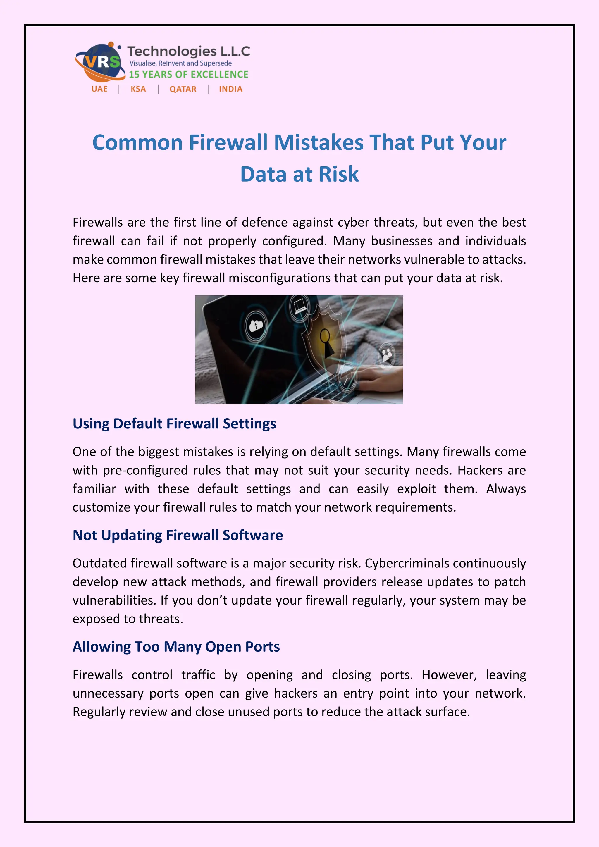 Avoid common firewall mistakes that expose your data to cyber threats. Secure your network effectively! VRS Technologies LLC offers the most secured services of Firewall Solutions Dubai. For more info contact us: +971-56-7029840 visit us: https://www.vrstech.com/firewall-solutions.html