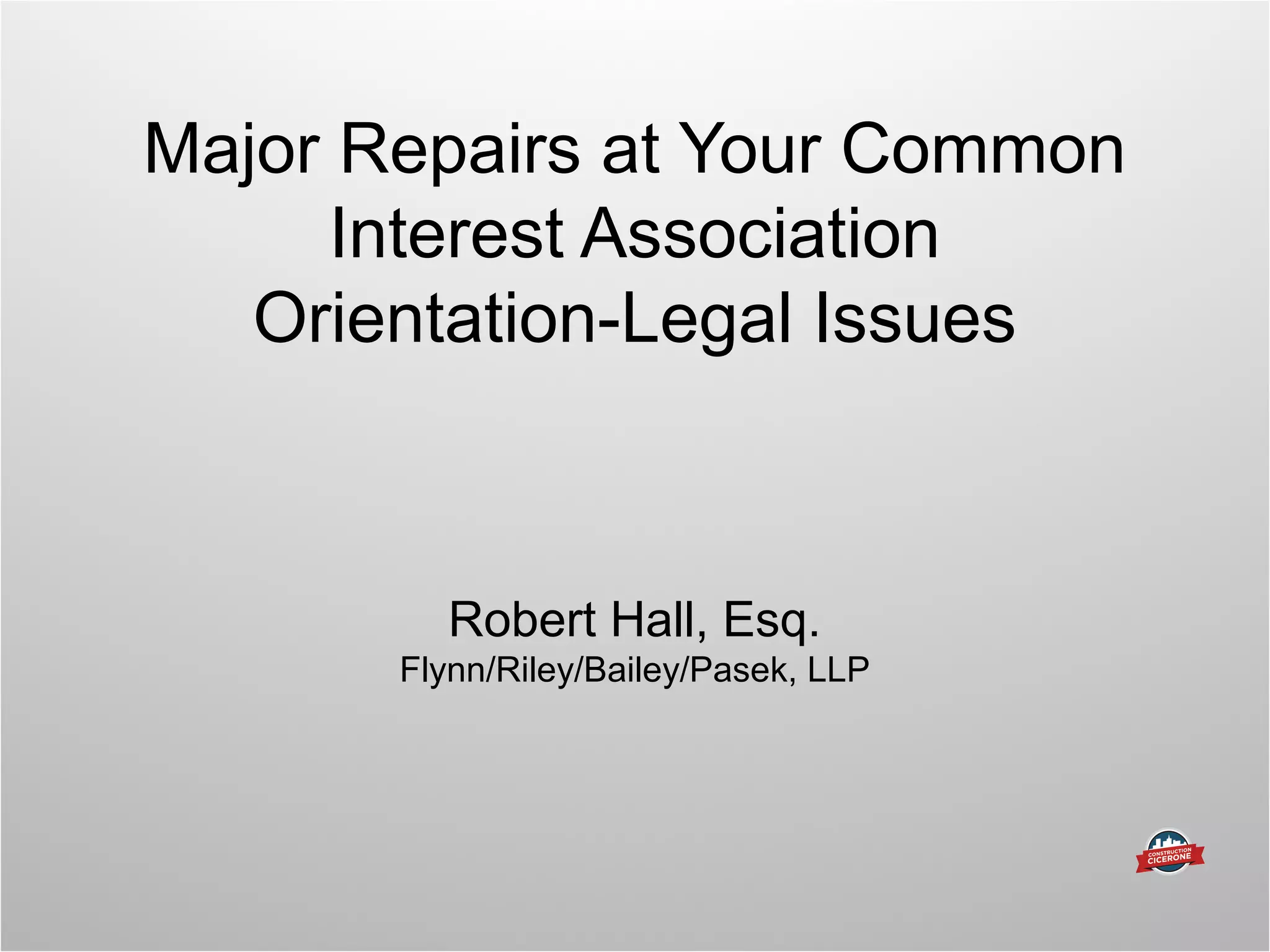 This document discusses key legal issues that homeowners associations should consider when undertaking major repair projects. It recommends: