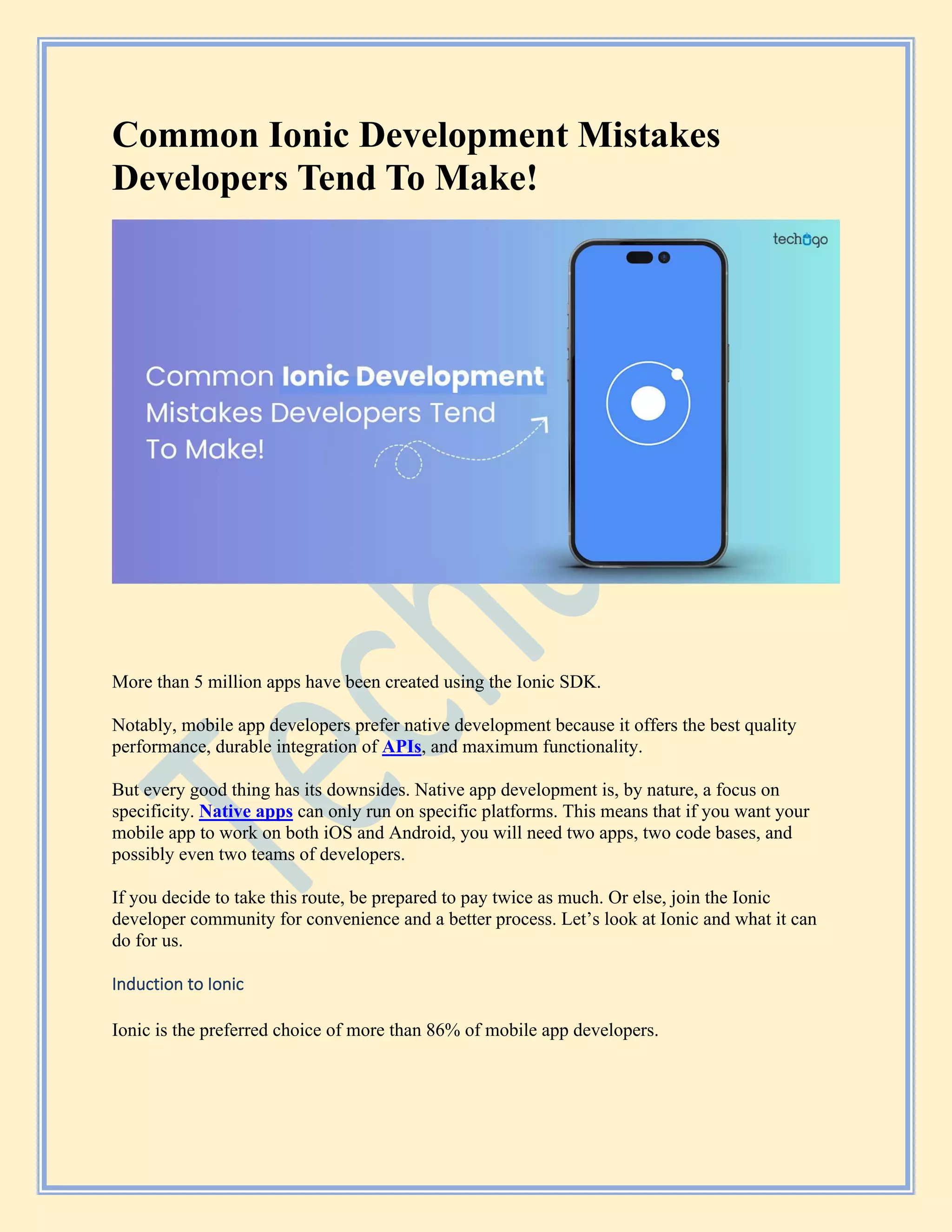 The document discusses the advantages and disadvantages of using Ionic as a framework for cross-platform mobile app development, highlighting its popularity among developers and ease of use with web technologies. It notes that while Ionic offers benefits such as a single codebase and extensive community support, it also has drawbacks including reliance on plugins, potential performance issues, and application size. Additionally, the document outlines common mistakes made by Ionic developers and provides insight into how to leverage Ionic effectively.